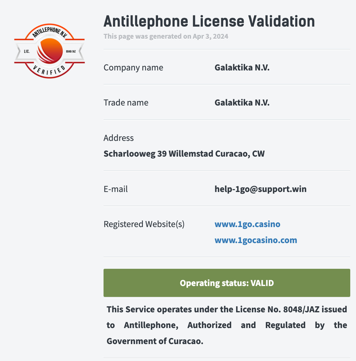Αριθμός αδείας 8048/JAZ που εκδόθηκε στην Antillephone, εξουσιοδοτημένη και ρυθμιζόμενη από την κυβέρνηση του Κουρασάο.
